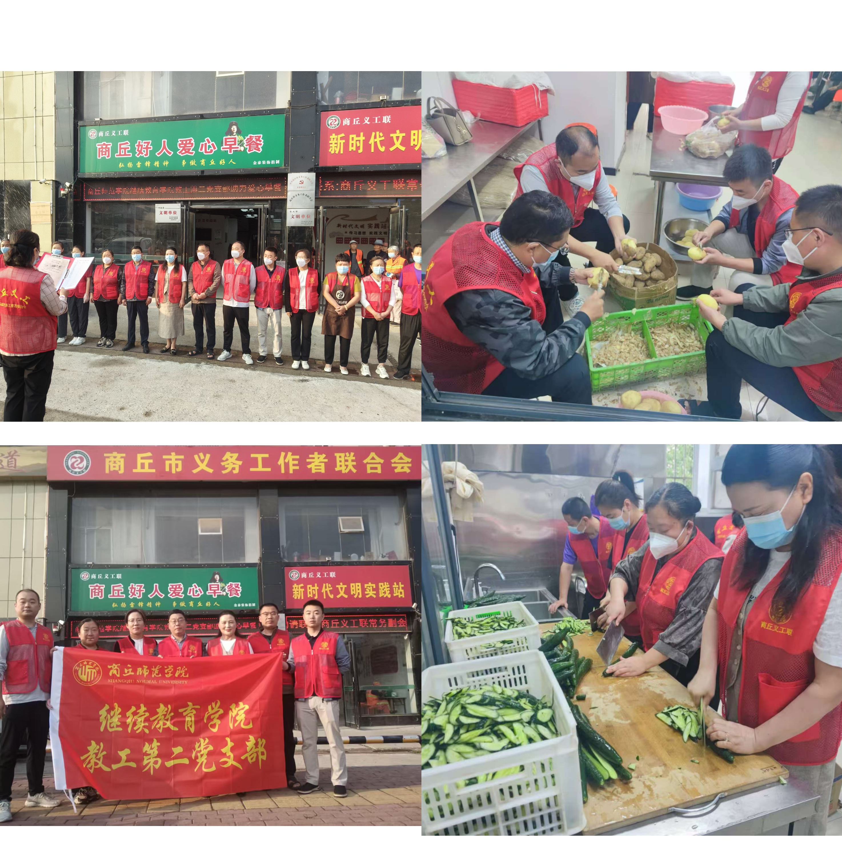 早上五点多钟,各位党员老师到达活动现场后,马上就投入到忙碌的准备工作中。有的负责洗菜、切菜,有的负责准备桌椅板凳,有的负责煮粥、熬汤,有的负责发放饭菜。大家分工明确、配合默契,用满满的爱心,为环卫工人们准备着一顿丰盛的早餐。