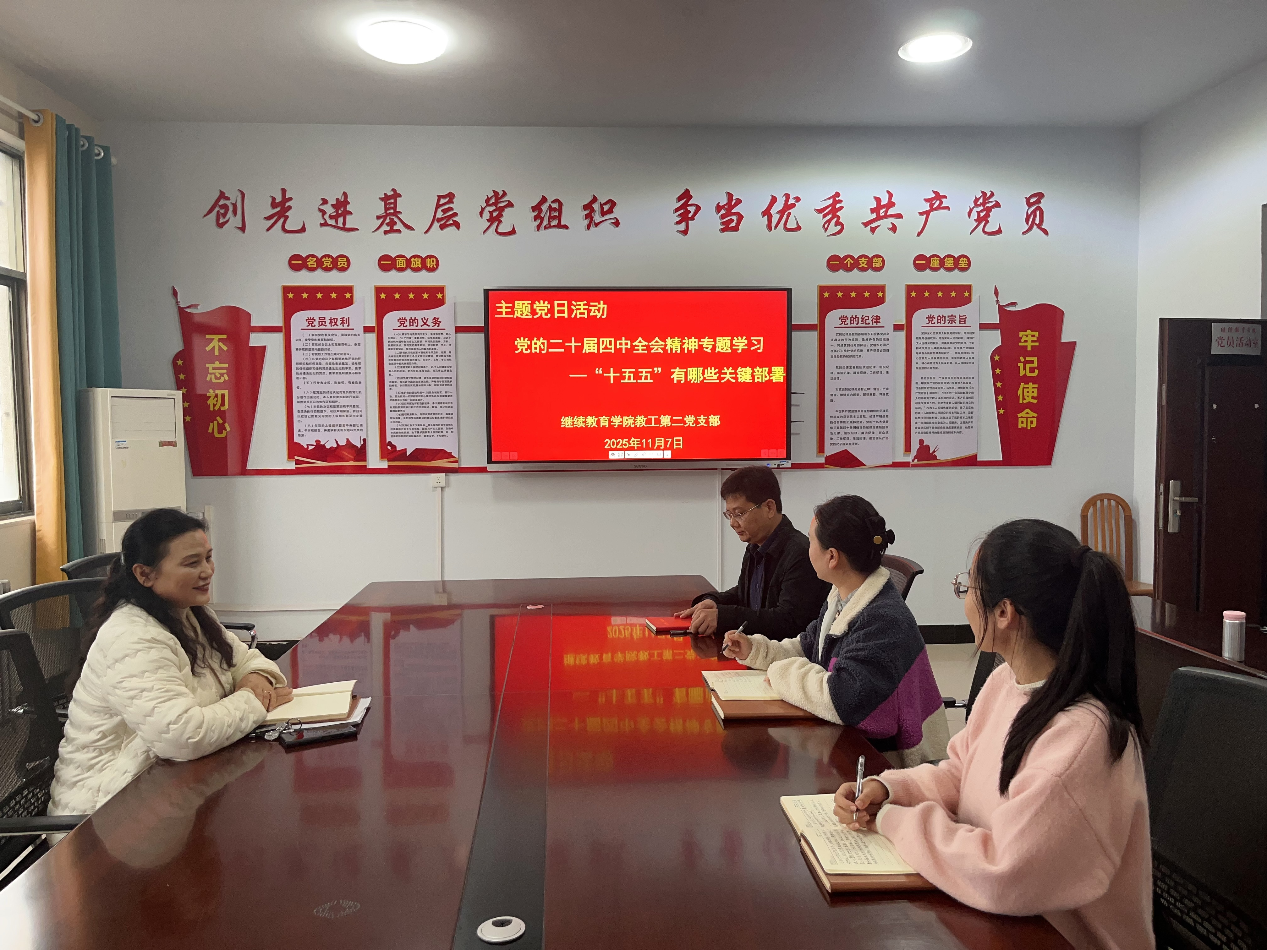 为深入学习贯彻党的二十届四中全会精神,全面把握“十五五”时期经济社会发展的关键部署,11月7日下午,伟德国际bevictor1949教工第二党支部在307会议室开展共学“‘十五五’关键部署,凝聚奋进力量”主题党日活动。李玲主持学习研讨。