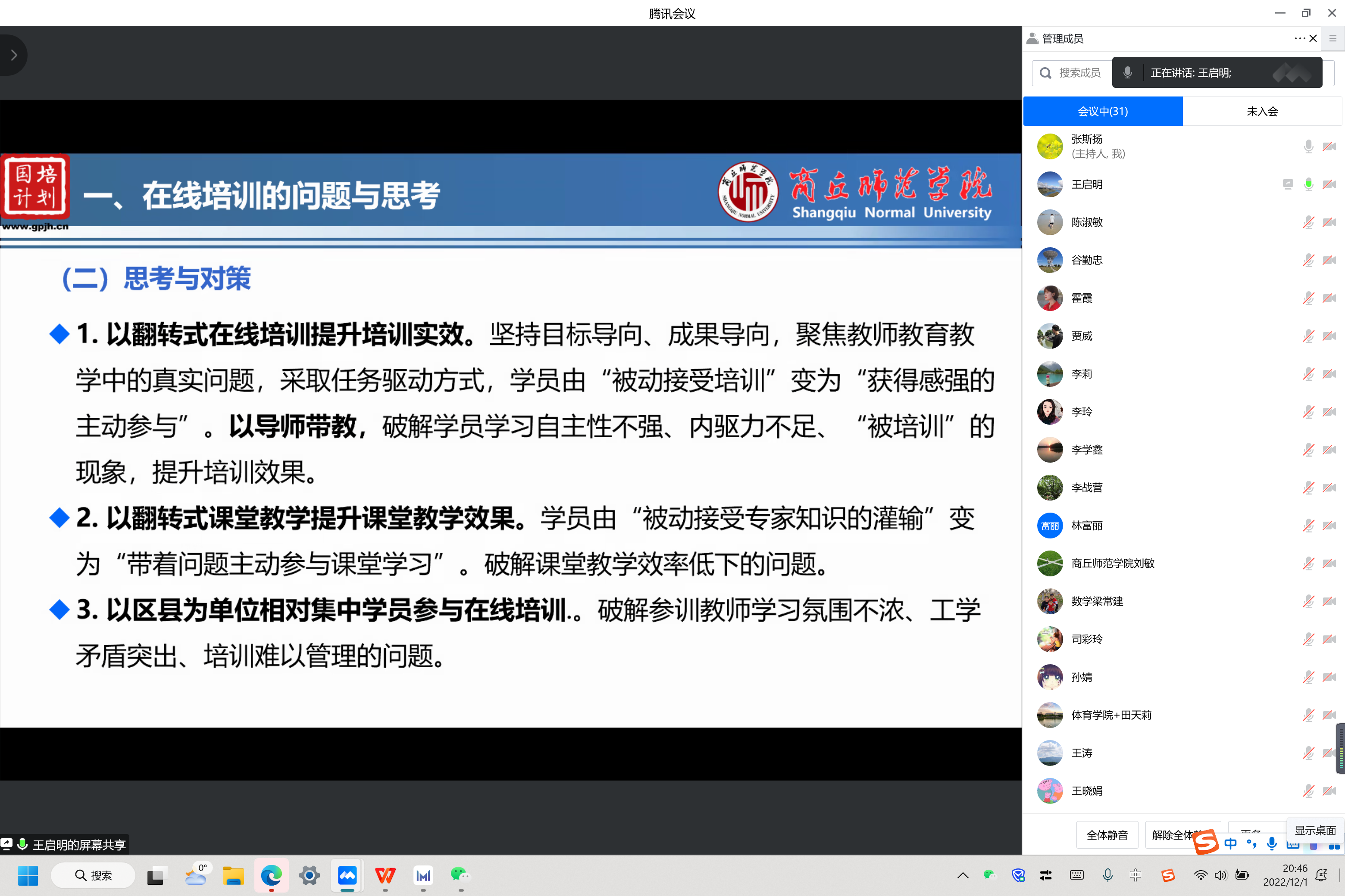 司彩玲副经理对于线上培训需要注意的问题进行了强调和补充。最后李玲经理做了总结发言,对大家的辛勤付出表示感谢和敬意,勉励大家克服新冠疫情影响和线上培训的各种困难,确保“国培计划”“省培计划”项目的顺利实施和圆满完成。