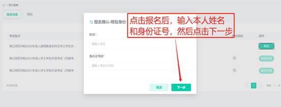 5.点击报名,输入个人真实姓名和身份证号,确认无误后点击下一步。
