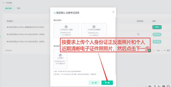 6.依次上传身份证照片和个人近期证件照照片,建议照片先保存到手机相册或者电脑桌面。
